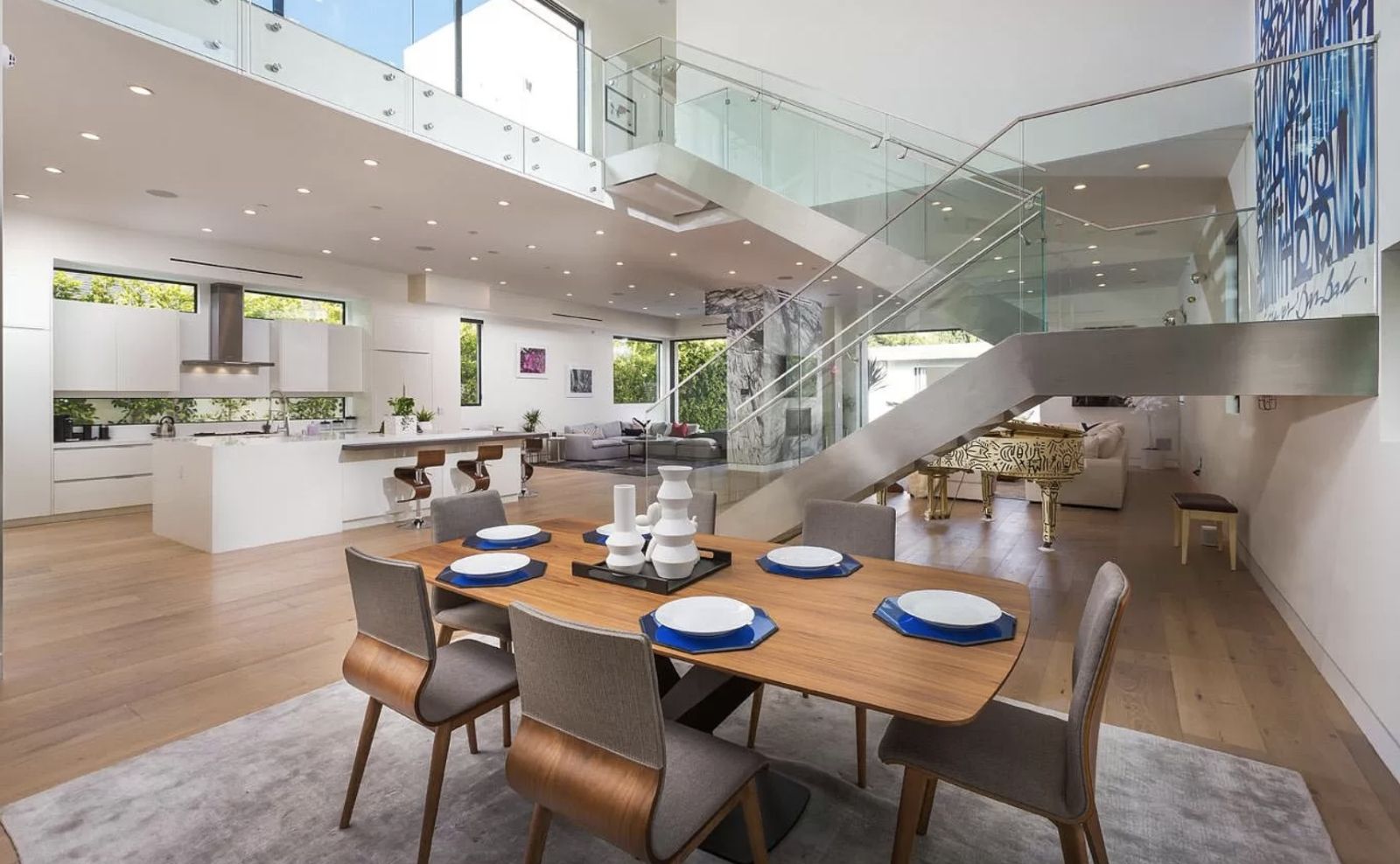 Los sillones en tonos grises son los grandes protagonistas, sobre los cuales tiene algunos cojines con estampas para brindar un poco de color al espacio. En ese mismo piso hay un gran piano de cola blanco y al lado se encuentra la cocina, la cual tiene un diseño exquisito, pensado para amalgamarse con el resto del lugar y no contaminar visualmente el espacio.
