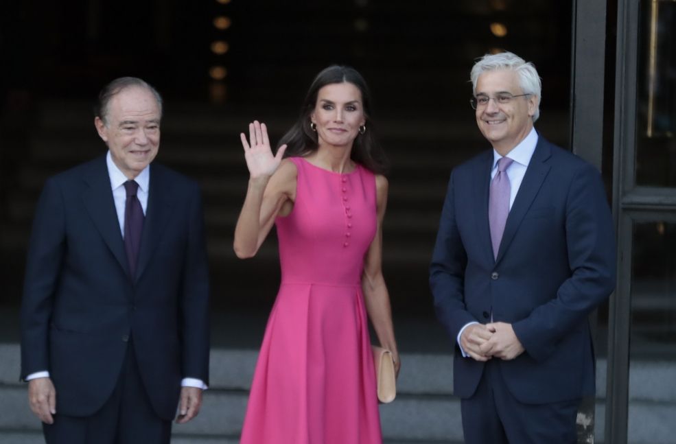 Para un compromiso en el Teatro Real de Madrid, la consorte lució un vestido fucsia de Carolina Herrera, confeccionado exclusivamente para ell: la silueta es estilo ladylike con largo midi, cuello redondo, sin mangas y botones delanteros que le dan un detalle único. Letizia de España sabe cómo adaptar la moda a sus necesidades reales.