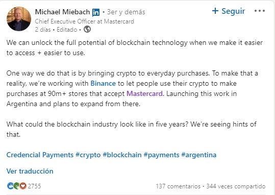 "Una forma de hacerlo es llevar las criptomonedas a las compras diarias. Para que eso sea una realidad, estamos trabajando con Binance para permitir que las personas usen sus criptomonedas para realizar compras en más de 90 millones de tiendas que aceptan Mastercard. Lanzamiento de esta obra en Argentina y planes de expansión desde allí", explicó Miebach.