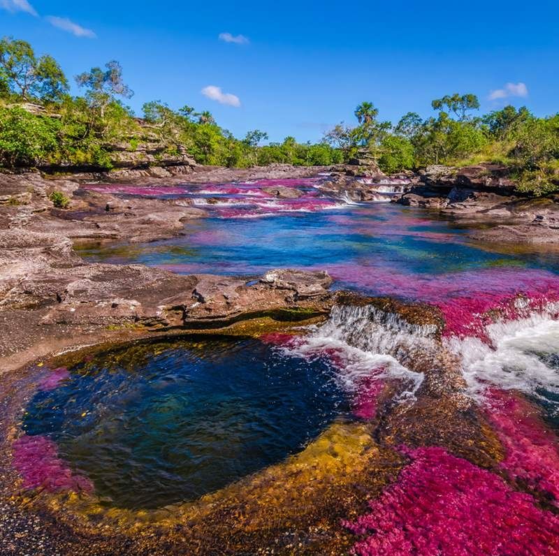 En el departamento de Meta se encuentra la sierra de la Macarena donde se puede contemplar el río Caño Cristales. ¿Cuál es su característica única? En su fondo se reproducen plantas acuáticas que con la exposición al sol cambian de color en un proceso que va desde el verde hasta un rojo intenso, por lo que se llama "el río mas hermoso del mundo" .