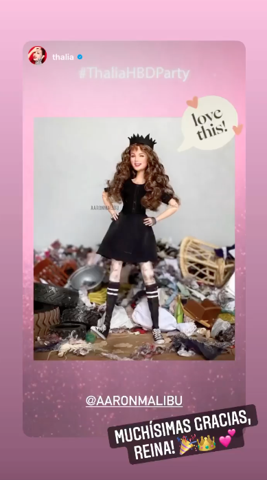 Otro de los regalos originales que más cautivaron a Thalia fue una muñeca tipo Barbie con su cara, vestida como su personaje de María la del barrio, una de sus icónicas novelas. “Esto me mató. Esta me las hace un chico que se llama Aron, me prometió que me va a hacer toda la colección, me encanta, porque soy idéntica”, reconoció la artista.