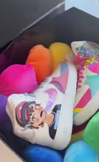 Pero hubo dos obsequios que lograron llamar la atención de la artista mexicana y que compartió con sus millones de seguidores en sus redes sociales. Es sabido que Thalía es fanática de las sneakers, tiene cientos de modelos que usa para looks más formales y otros más casuales. Pero estas sneakers personalizadas, pintadas a mano, sí que lograron cautivarla. “Dios mío, vean por favor esto. One of a kind, hechos para mí. Con mi avatar de mi NFT Collection, ¡los amo! @by_porti gracias”, comentó Thalía.
