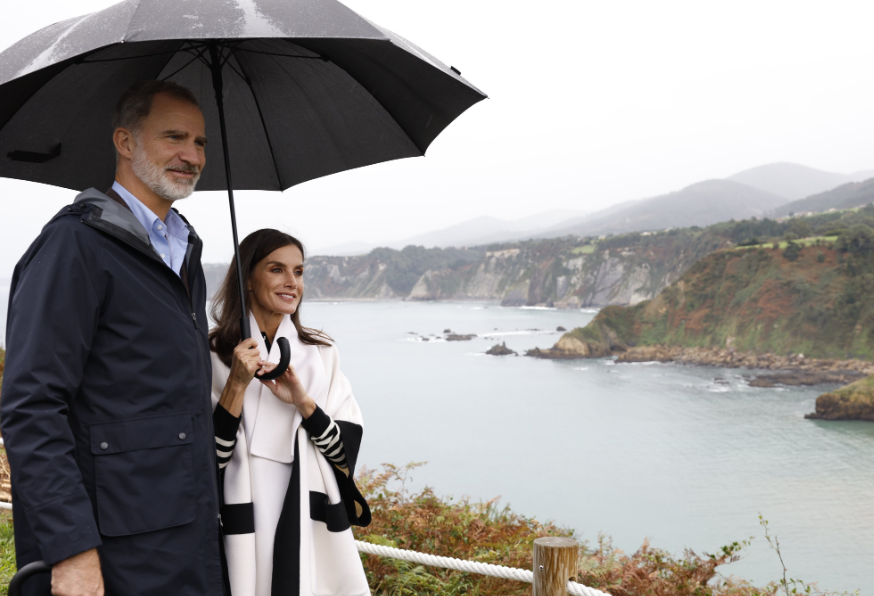 Sin embargo, cuando comenzó a refrescar y empezaron a caer algunas gotas de lluvia, los reyes tuvieron que ponerse ropa de abrigo y el outfit de la reina se llevó todas las miradas.