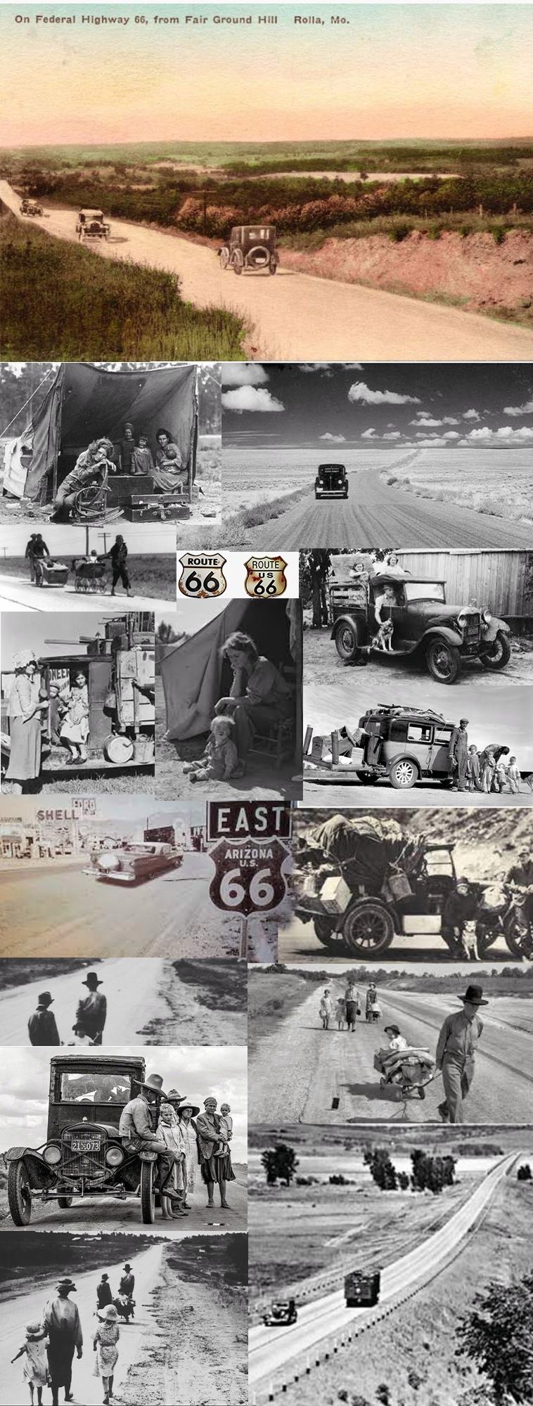 La Ruta 66 no sólo une el este con el oeste, sino que también ha sido un símbolo de las oportunidades cuando hubo momentos críticos con cambios sociales y económicos. Apenas unos años después de que se inaugurara la 66, que también fue la primera ruta asfaltada de Estados Unidos, esa nación empezaba a vivir la peor crisis económica de toda su historia con la gran sequía (1930-39, en lo que se conoce como "dust bowl"). Y esto llevó a muchos habitantes del centro y este a emprender el arduo viaje hacia el oeste La Ruta 66 fue el camino de la esperanza y la oportunidad hacia una vida mejor, sobre todo en estados que abrieron sus puertas para estos nuevos habitantes, como California. Es decir que en el peor momento de la historia de Estados Unidos la Ruta 66 fue un salvavidas para buscar un nuevo comienzo, una nueva oportunidad y, en definitiva, la felicidad. Esto explica que también tenga un papel esencial en la formación de la cultura, la economía y la textura social de los Estados Unidos. La siguiente imagen constituye en sí un resumen de las historias de vida de miles de estadounidenses pobres que atravesaron la Ruta 66 en busca de una nueva oportunidad.
