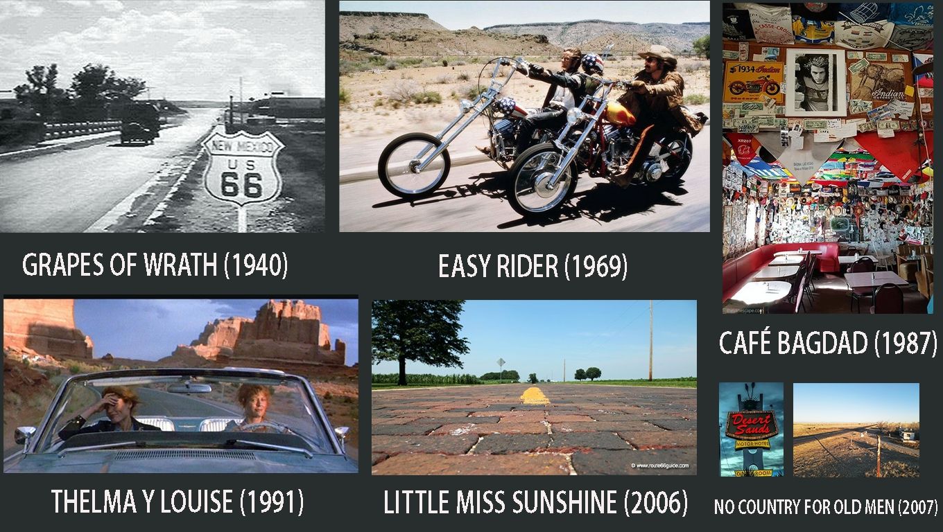 Estas historias de vida de miles de estadounidenses que atravesaron la pobreza y gracias a la Ruta 66 lograron encaminarse hacia un nuevo rumbo ha quedado asentado en la escritura, la música y el cine. Por eso la ruta 66 ha sido escenario de infinitas historias, melodías y películas, principalmente The Grapes of Wrath (1940) - traducido como Las Viñas de la ira - de John Steinbeck, que recibió un premio Pullitzer y pocos años después John Ford lo llevó al cine en un film de realismo social con figuras como Henry Fonda .y John Carradine. Luego la Ruta 66 fue escenario de otros films como Easy Rider (1969), National Lampoon’s Vacation (1983), , Starman (1984), Bagdad Cafe (1987) y Thelma y Louise (1991), entre algunos.