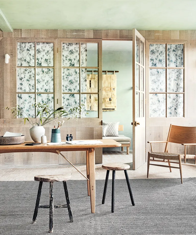 En esta sala el techo pintado de verde combina perfectamente con el diseño rústico inspirado en la naturaleza. Aquí se ha utilizado la pintura con cal, que puede crear una apariencia suave y confortable.