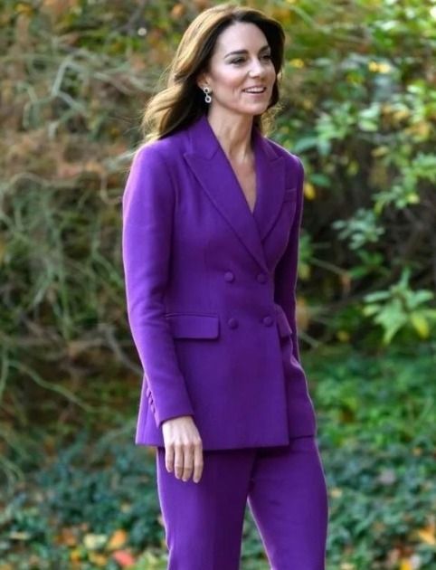 El traje y el pantalón de vestir en composé en tonos lilas, además de ser visualmente llamativos, realzan la figura de la Princesa Kate, mostrando su gusto por la moda con un toque de refinamiento. Esta elección de vestuario proyecta una imagen de sofisticación y frescura, acorde con la ocasión y su rol público.
