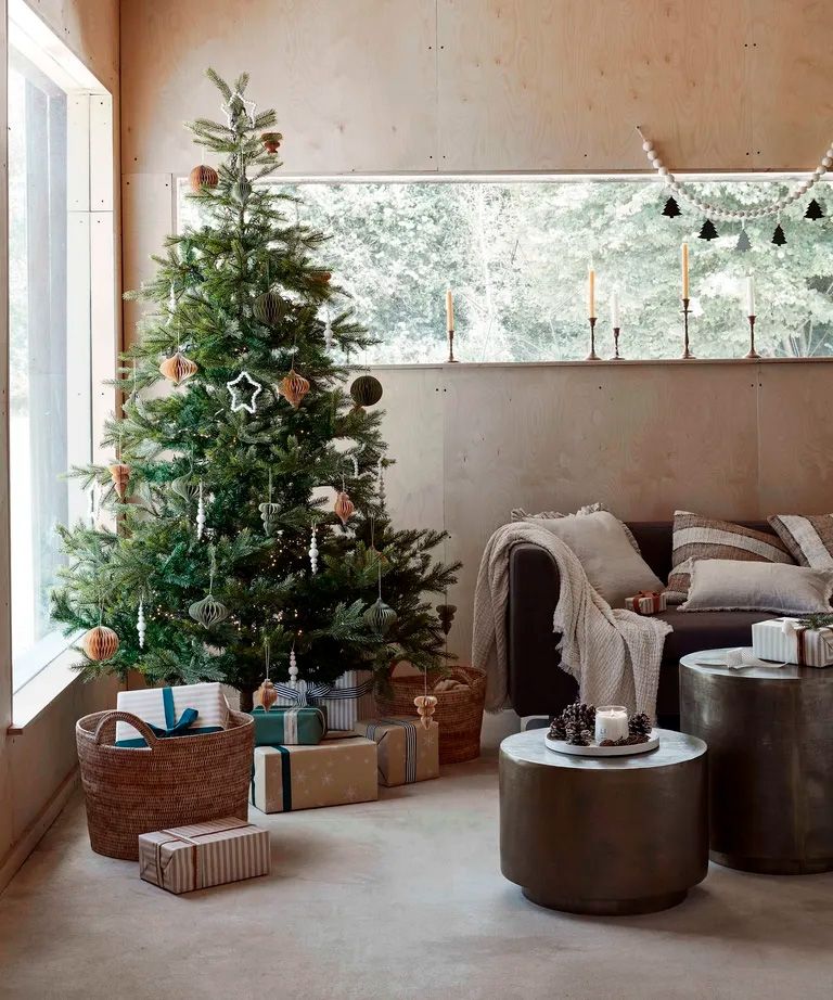 Por más divertido que resulte llenar de cosas el árbol de Navidad optar por un diseño más simple y minimalista permite celebrar la belleza natural del árbol (ya sea real o falso), tanto para una apariencia minimalista como para decoración navideña rústica también.