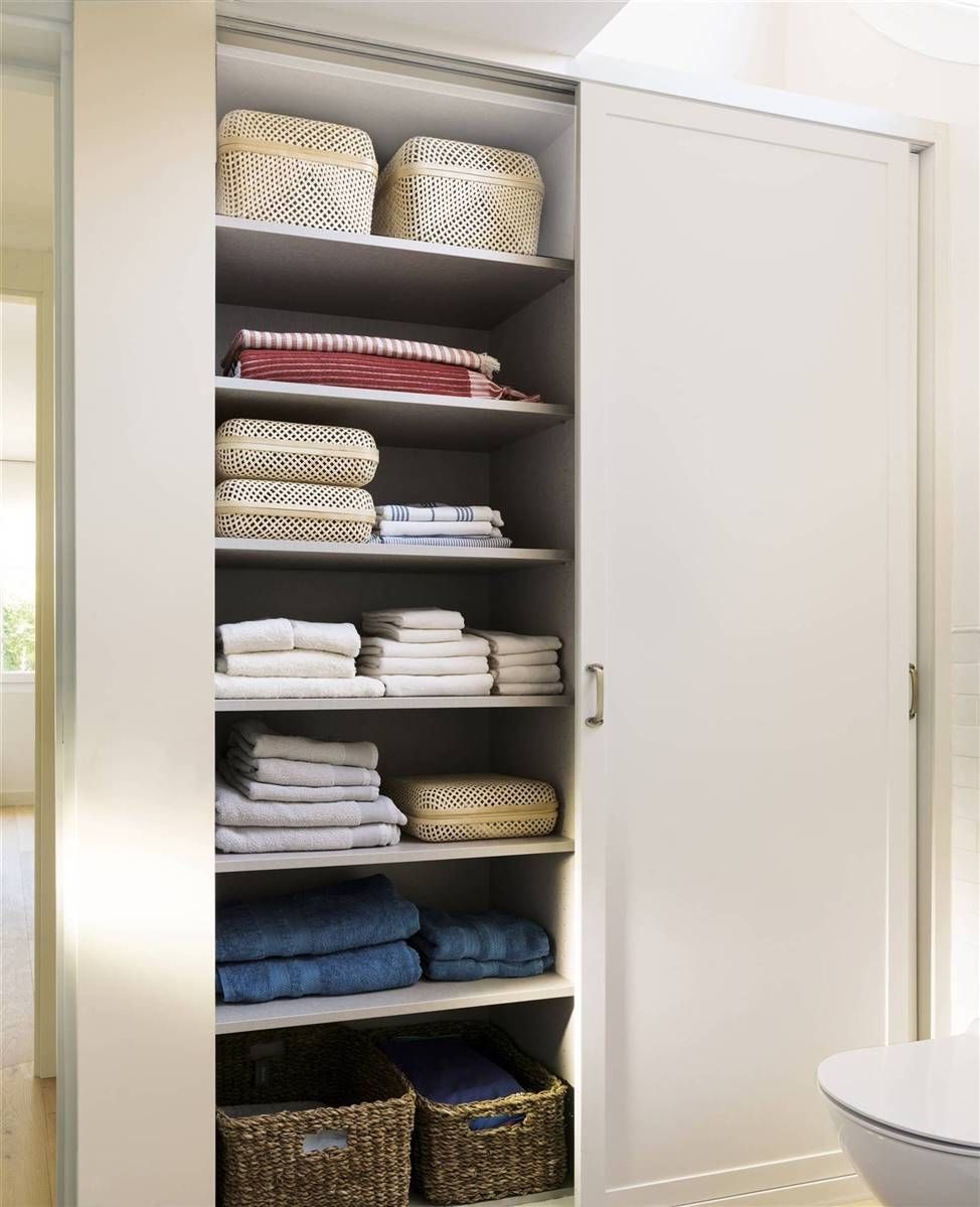 9. Planificar el almacenamiento. Destinar un espacio bien a un armario a medida o bien a uno para guardar las toallas y otra ropa de casa. Tenerla a mano y ordenada es fundamental para que el baño luzca más bonito y cómodo.