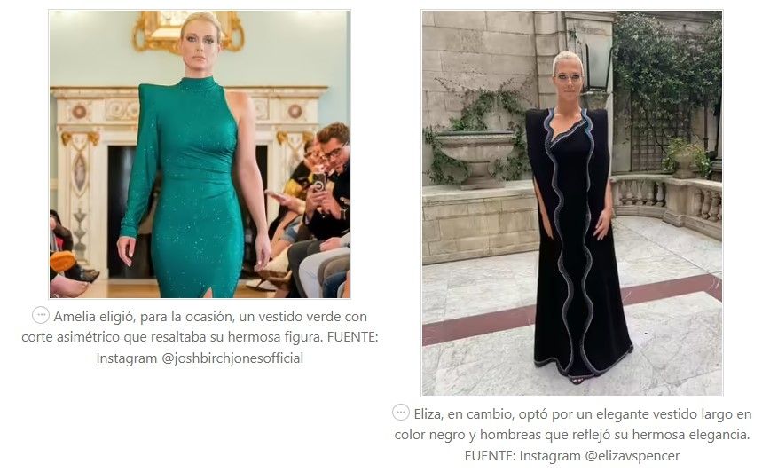Eliza hizo eco de las palabras de su hermana y felicitó al diseñador por su precioso desfile. El diseñador, encantado con las palabras de las gemelas, correspondió a sus elogios publicando una instantánea de las dos hermanas luciendo sus conjuntos; en los que afirmaba que las dos mujeres son "la viva imagen de la sofisticación".