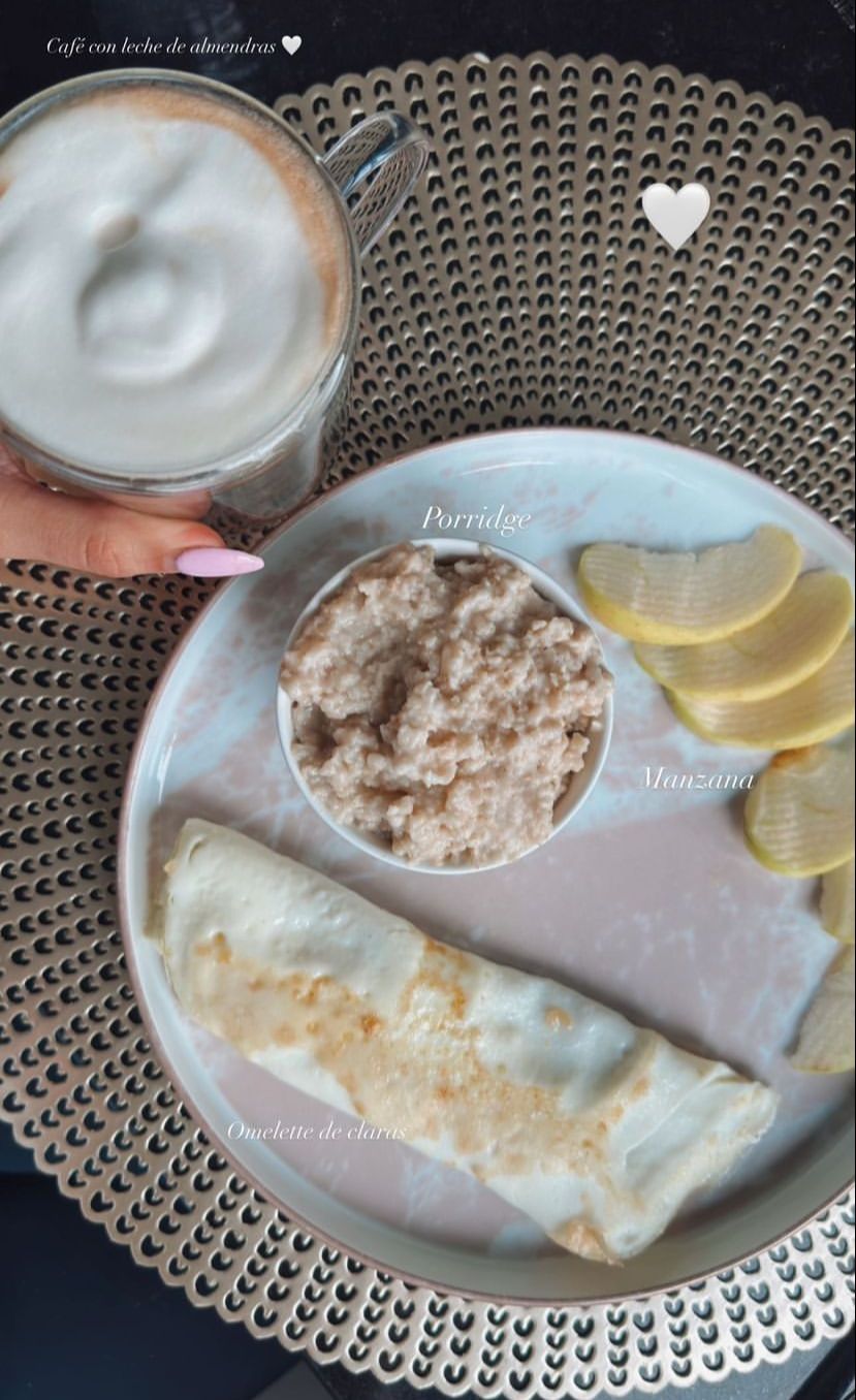 En este caso la modelo e influencer se encuentra transitando su segundo embarazo, y por esto su alimentación se tornó extremadamente completa y saludable. Agustina compartió a través de sus historias de Instagram un desayuno que está compuesto por omelette de claras, manzana y porridge.