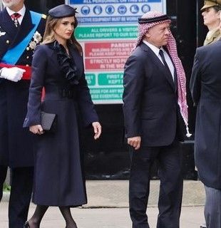 Por su parte, Rania de Jordania también se vistió de negro en Inglaterra cuando fue a despedir a Isabel II. Utilizó un abrigo largo con volante en una de las solapas y con cuello solapa cruzado. Además, llevaba zapatos de tacón alto, sombrero con un velo y un clutch, todo en tono negro.