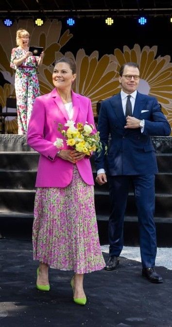 Victoria de Suecia también se animó al Barbiecore en un atuendo muy colorido y primaveral. La royal combinó un blazer fucsia de Zara junto con una falda midi plisada, de estampado floreado, top de satén blanco y stilettos de cuero verde. Distinta a sus colegas, Victoria añadió más color a su look Barbie.