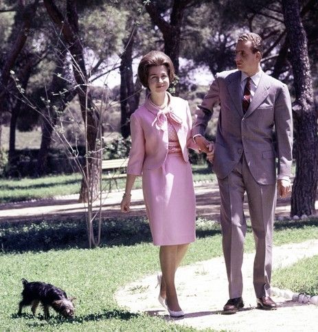 La reina emérita de España fue una de las pioneras en el uso del color rosa. En esta imagen se la puede ver junto a un joven Juan Carlos I utilizando una chaqueta y una falda rosa en dos tonos.