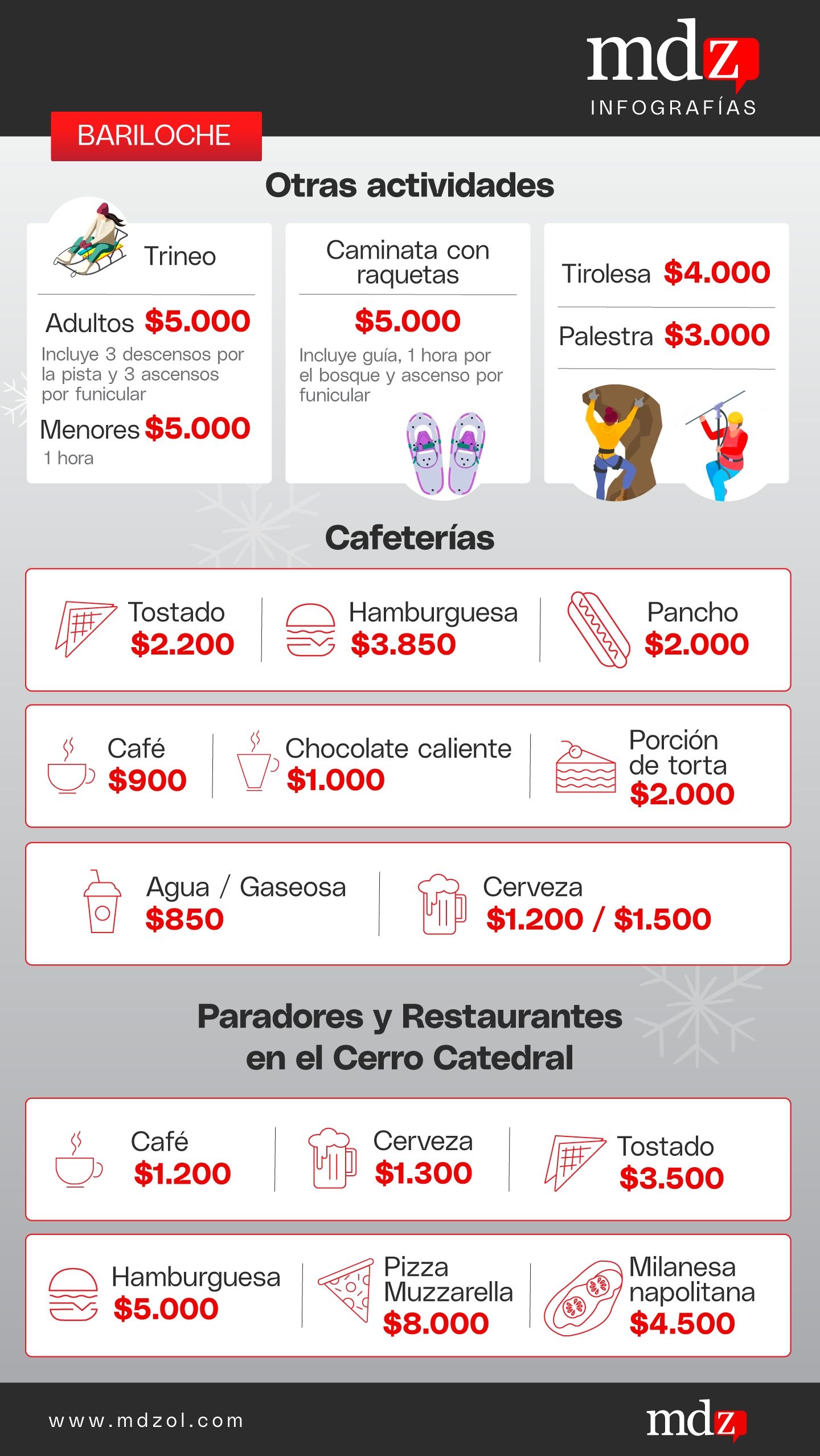 Mientras que en los paradores y restaurantes de montaña ubicados en Cerro Catedral, ideales para los esquiadores que disfrutan de todo el día en el centro de ski, los precios son: un café por $1.200, una gaseosa $1.200; una cerveza $1.300, un tostado $3.500, una hamburguesa cuesta $5.000, una pizza grande de muzzarella $8.000 y una milanesa a la napolitana $4.500.