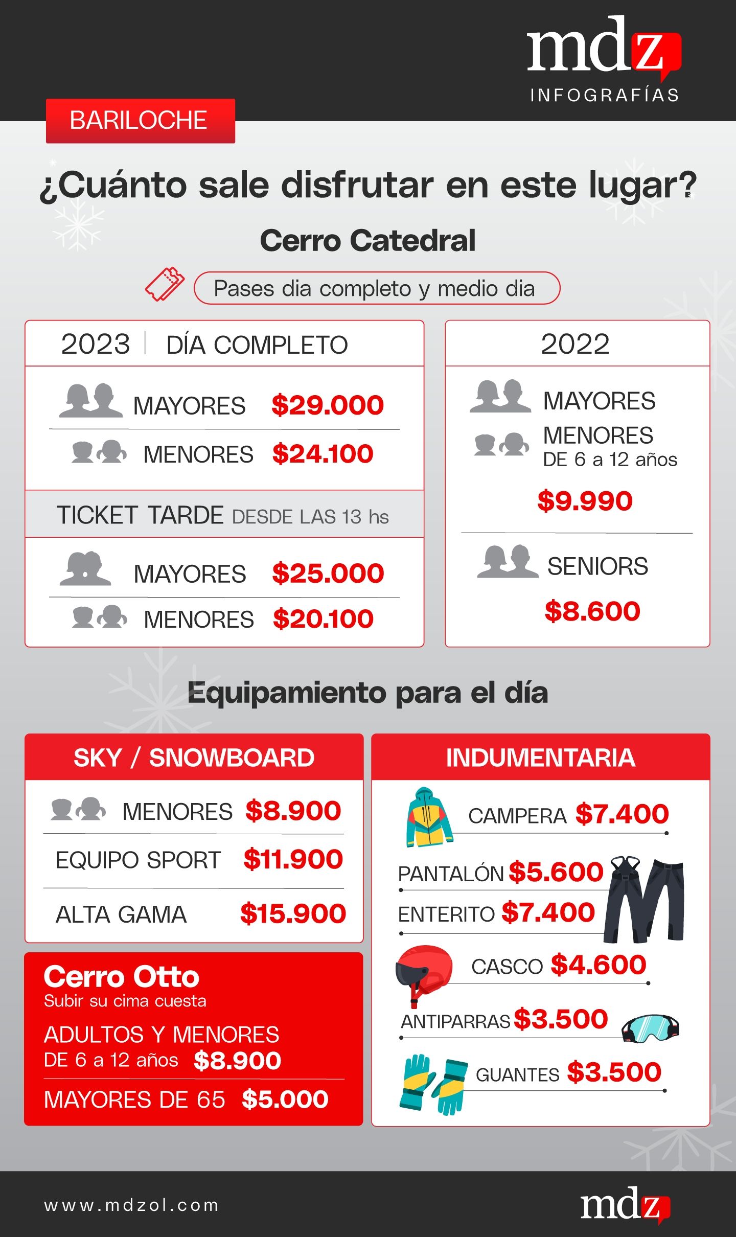 Este año Catedral, es el centro de ski que presenta las tarifas más elevadas para esta temporada de invierno. Los precios de los pases diarios están en $29.000 los mayores y $24.100 los menores, mientras que el ticket para la tarde (desde las 13 horas) es de $25.000 los mayores y $20.100 menores.