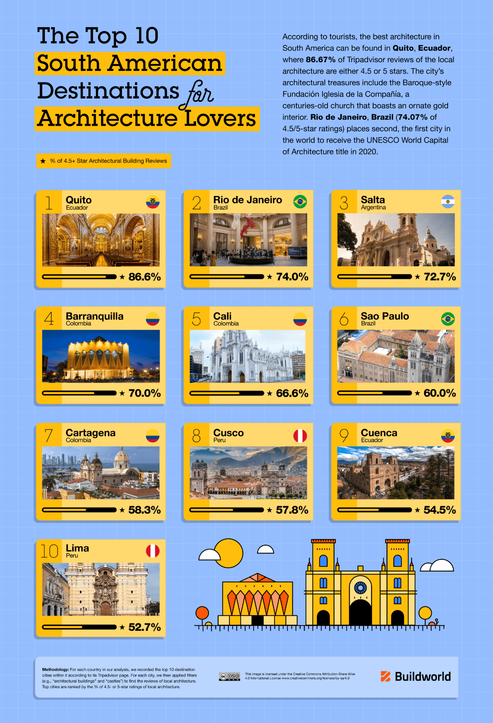 En América del Sur, Quito en Ecuador es el principal destino arquitectónico, con un 86,67% de las atracciones calificadas con al menos 4,5 en Tripadvisor. Los tesoros arquitectónicos de la ciudad incluyen la Fundación Iglesia de la Compañía, de estilo barroco, una iglesia centenaria que cuenta con un interior adornado en oro.