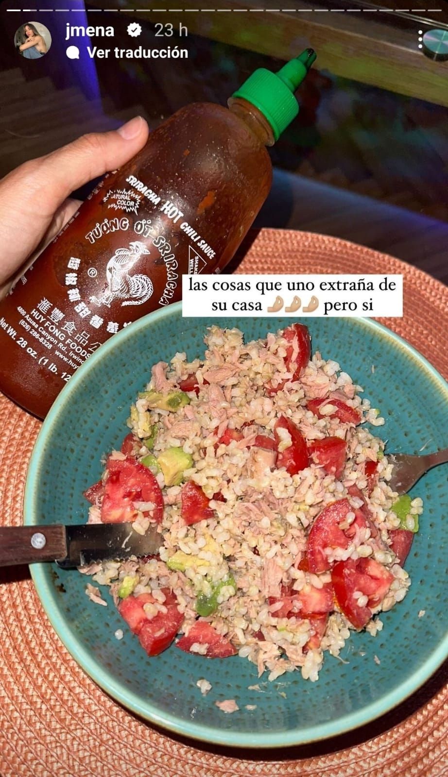 La salsa picante que acompaña la ensalada revela la inclinación de la artista hacia sabores intensos y emocionantes. Este condimento añade un toque de audacia a la experiencia gastronómica. La combinación de ingredientes frescos con una salsa picante sugiere una apreciación por la diversidad de sabores y la experimentación en la cocina.
