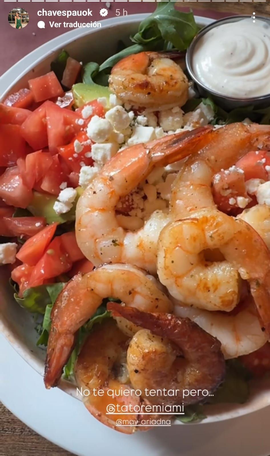 En el almuerzo de Paula se pudo ver un puñado de camarones salteados con paltas fileteadas, tomates cortados en pequeños cuadrados, queso tipo ricota y una salsa tipo dip para mojar los alimentos. Sin dudas, Chaves es fanática del buen comer.