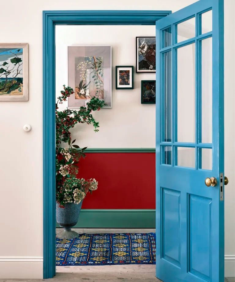 6. Un pasillo estrecho. La mayoría de las veces, las entradas son espacios largos y estrechos que reciben poca luz natural. Eso se puede cambiar con un uso inteligente de la pintura, como por ejemplo combinando un color oscuro en la mitad inferior de las paredes con un color más claro en la mitad superior de la pared: esto hará que el espacio parezca más amplio y lleno de luz al instante.
