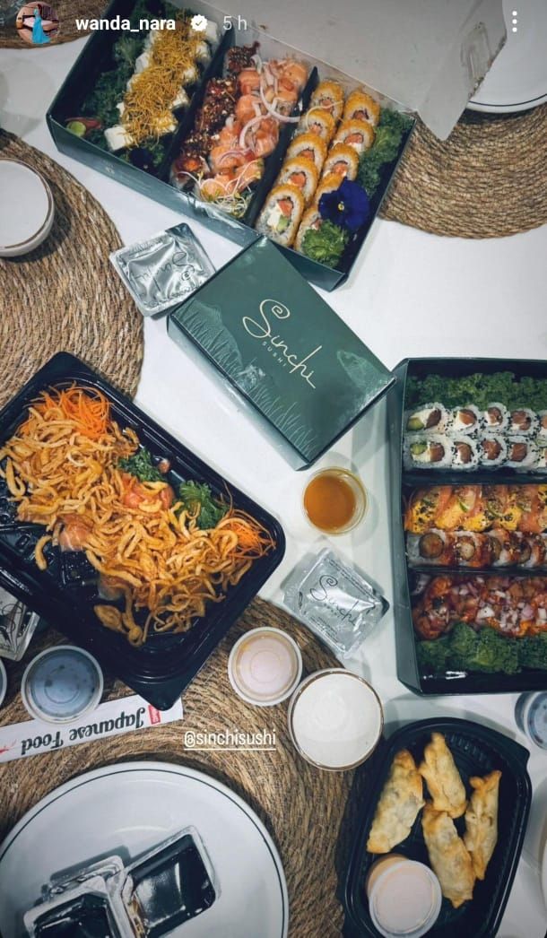 La conductora de Bake Off Famosos compartió una foto donde se puede ver una mesa repleta de cajas de sushi con pequeños bowls con salsas y palillos para consumir la típica comida oriental. En su historia de Instagram, Nara etiquetó al local al que pidió, por lo que pudo haberse tratado de un canje.