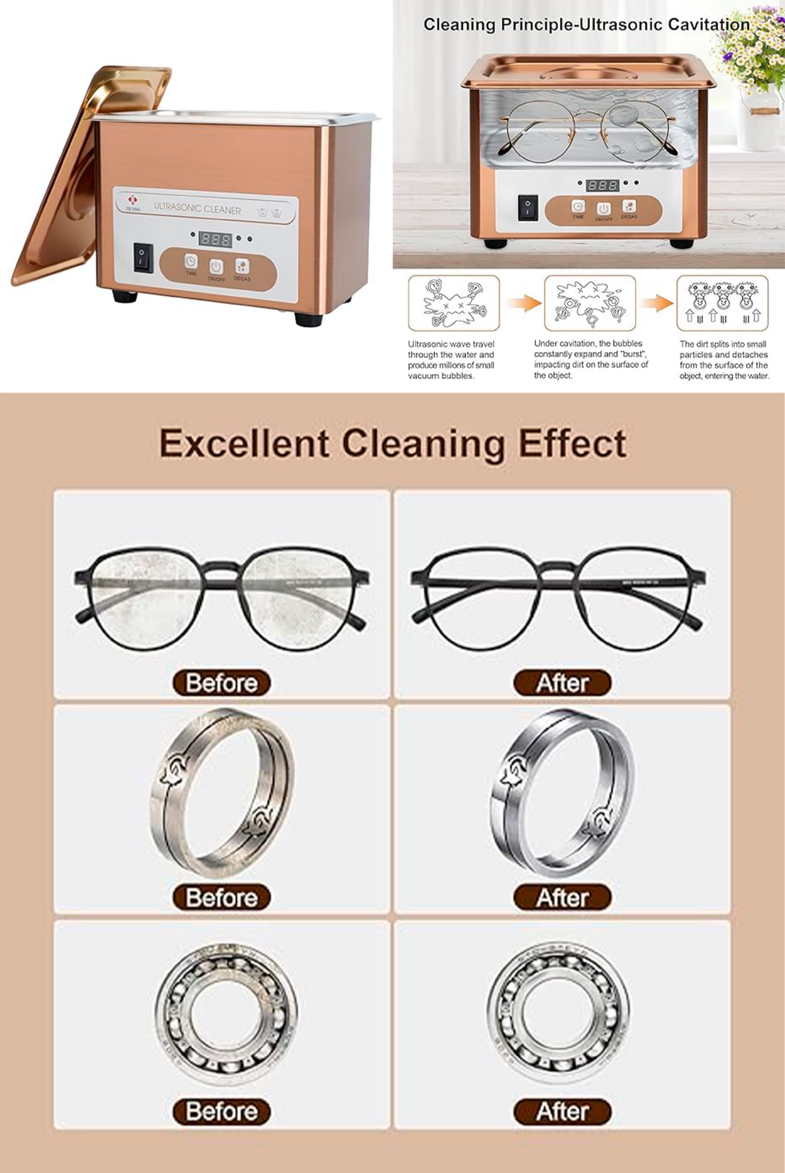 Limpiador ultrasónico. Fuente: Amazon.com - Limpiador ultrasónico. Existen prototipos como el InvisiClean, altamente calificado por los clientes para eliminar cualquier residuo de suciedad de las joyas agitando adecuadamente un líquido con ondas sonoras de alta frecuencia para que se limpien las áreas donde un cepillo generalmente sería ineficaz. Este procedimiento funciona para piezas de oro, diamantes y platino, ya que pueden soportar ligeras vibraciones y son insusceptibles a cambios o daños causados ??por el movimiento. No usarlo para limpiar cualquier piedra preciosa con inclusiones, como esmeraldas o morganita, porque las vibraciones del limpiador ultrasónico a menudo sólo empeorarán los defectos o daños existentes.
