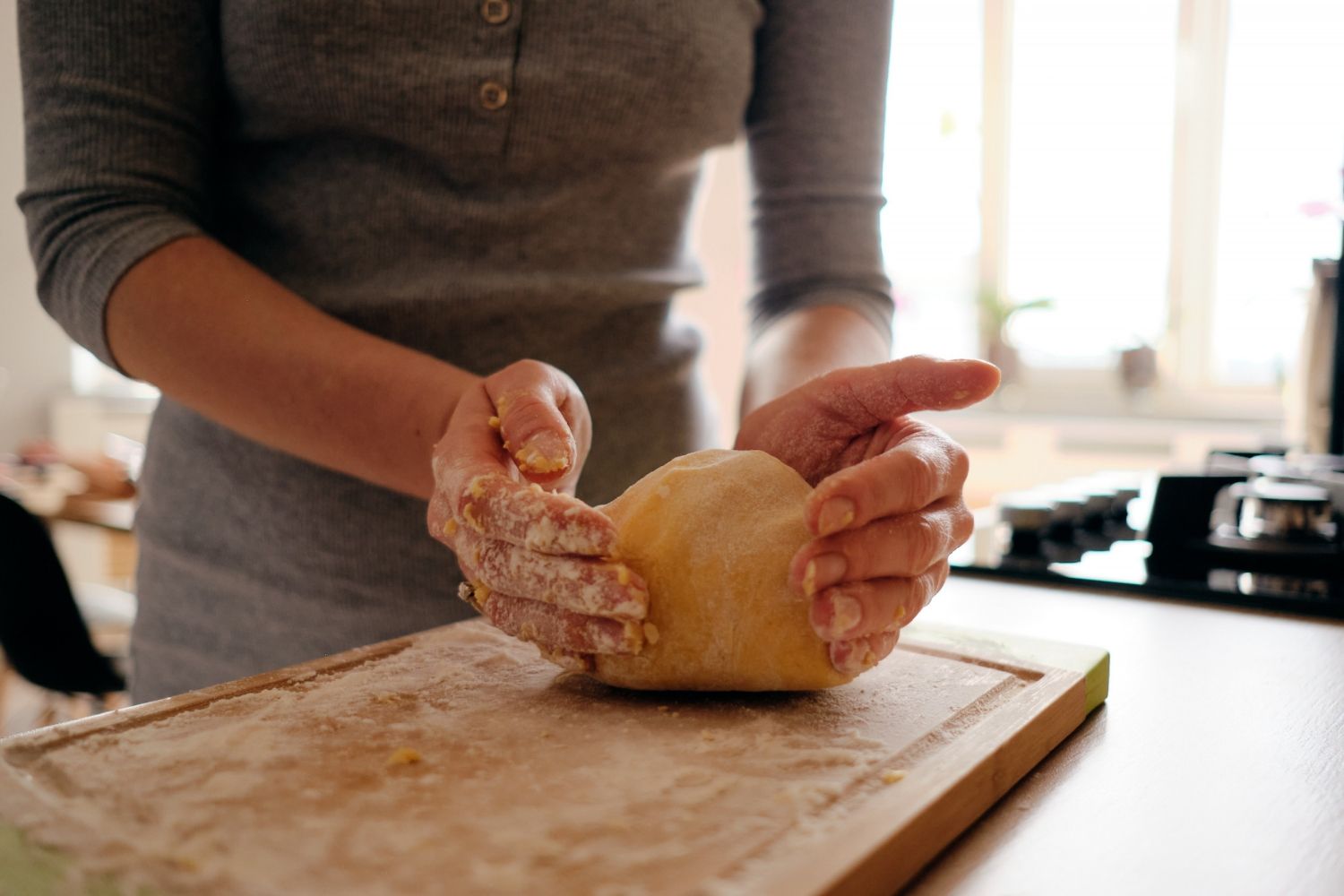 4) Cuando haya doblado, aplastamos la masa sobre la encimera ligeramente enharinada para desgasificarla y formamos un rollo.