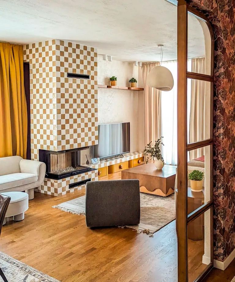 - Convertir los azulejos y baldosas en una declaración de estilo: aquí, los azulejos a cuadros llamativos, se extienden por toda la repisa de la chimenea y el estante contiguo, en contraste con los azulejos hechos a mano, más simples y con más textura, de la pared detrás del televisor.
