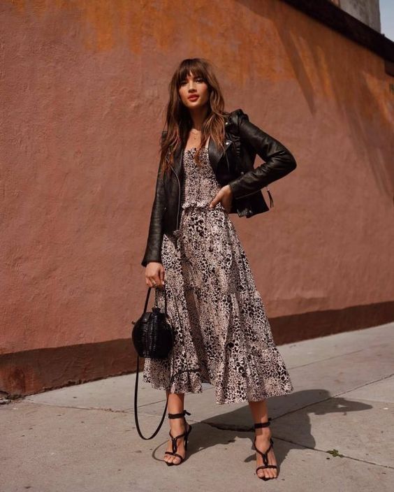 Para las que prefieren un estilo más delicado pero igual de poderoso, el contraste con prendas boho chic es una excelente opción. Una chaqueta de cuero sobre un vestido vaporoso y unas sandalias gladiadoras crea un equilibrio perfecto entre lo rudo y lo romántico, dándole un toque único a tu outfit.