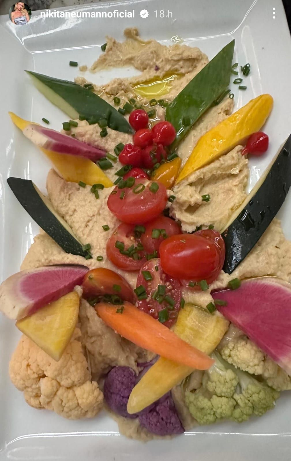 Nicole dejó ver que en su plato había un colchón de hummus esparcido en la base mientras que por encima cortó diferentes vegetales salteados como berenjenas y zucchini, cortados en rodajas. Al mismo tiempo, adhirió algunos vegetales y frutos frescos como zanahoria y tomates cherry.
