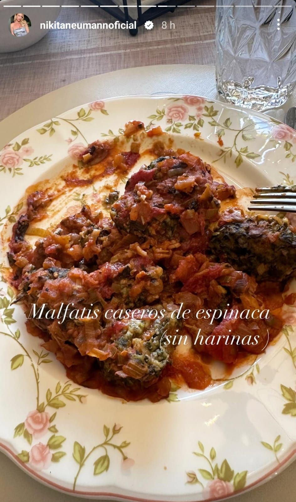 "Malfattis de espinaca caseros, sin harinas", escribió la influencer en un su posteo, donde se pudo ver un suculento plato lleno de la famosa pasta con una salsa de tomate. Es sabido que la modelo es vegana, por lo que no le puso queso rallado por encima.