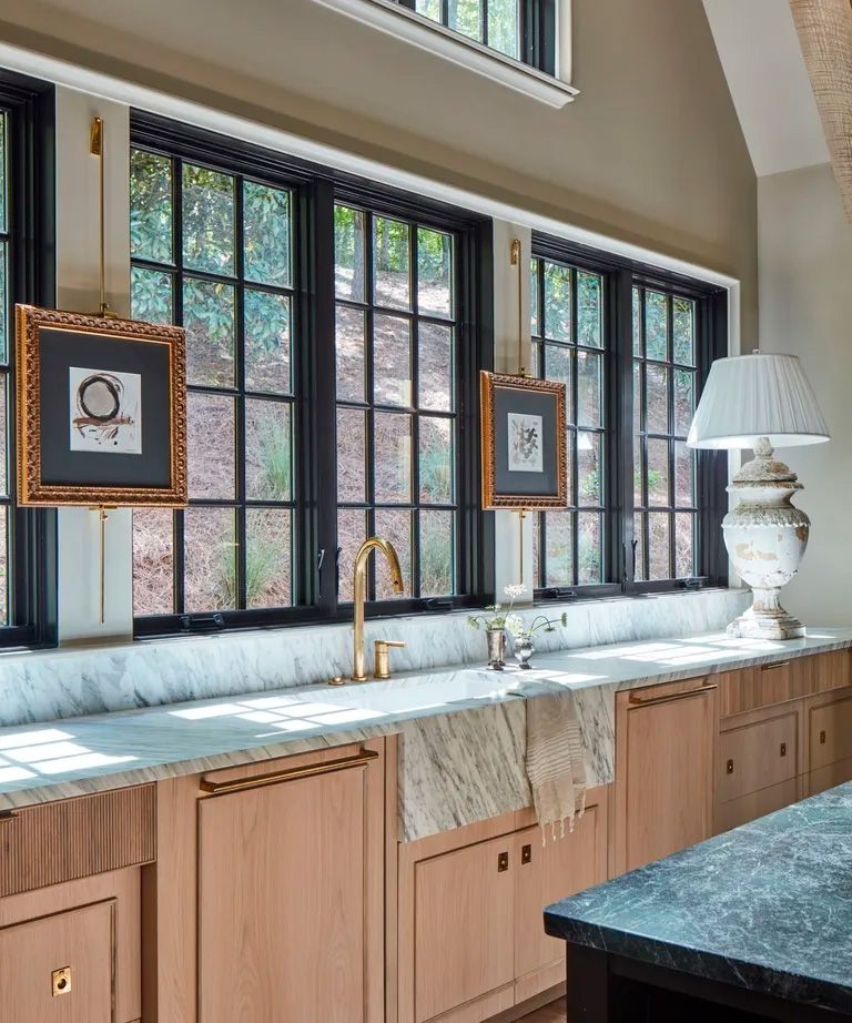 Como si esta entrada pudiera ser más elegante, la incorporación de pesadas ventanas con marcos negros proporciona un entorno en el que los demás elementos decorativos realmente pueden destacarse.