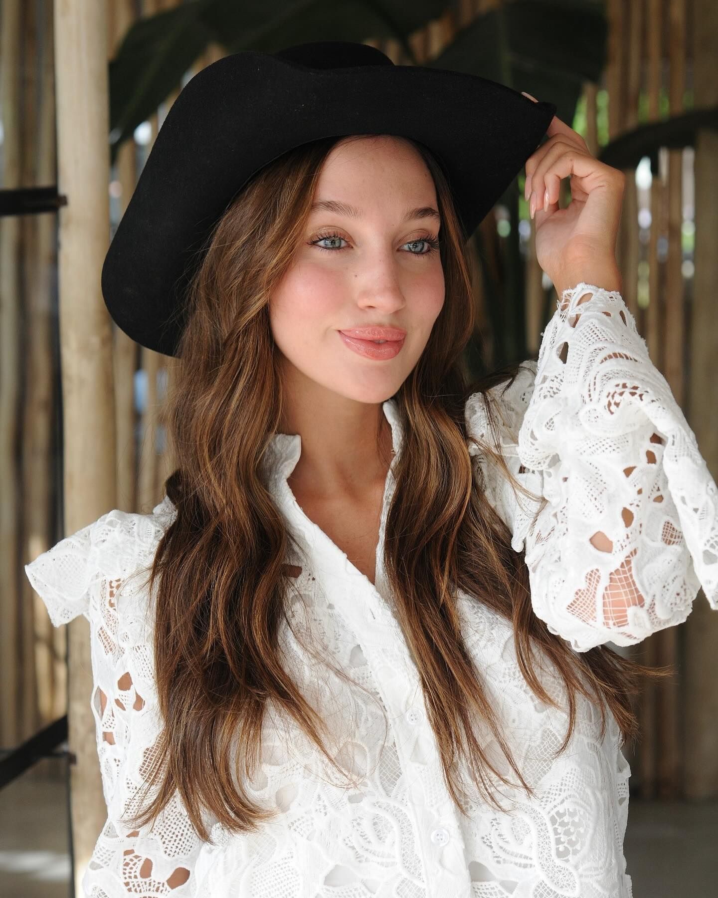 Pero Brenda no se detuvo ahí. Completó el look con un sombrero negro de ala ancha, que añadió un aire misterioso y boho. Este accesorio elevó el estilismo y demostró por qué es una experta en sumar detalles que marcan la diferencia.