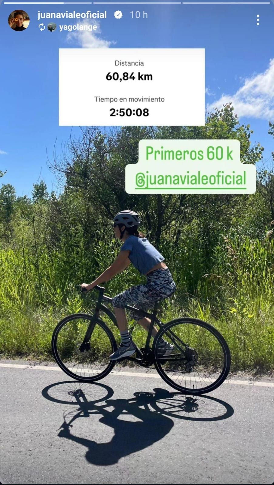 La protagonista de tiras como Malparida y del recientemente estrenado filme Virgen Rosa subió a sus redes fotos donde se la puede ver sobre una bicicleta, con un casco puesto y outfit deportivo, en lo que parece una ruta alejada de la urbe. "Primeros 60k", escribieron los tórtolos sobre su recorrido.