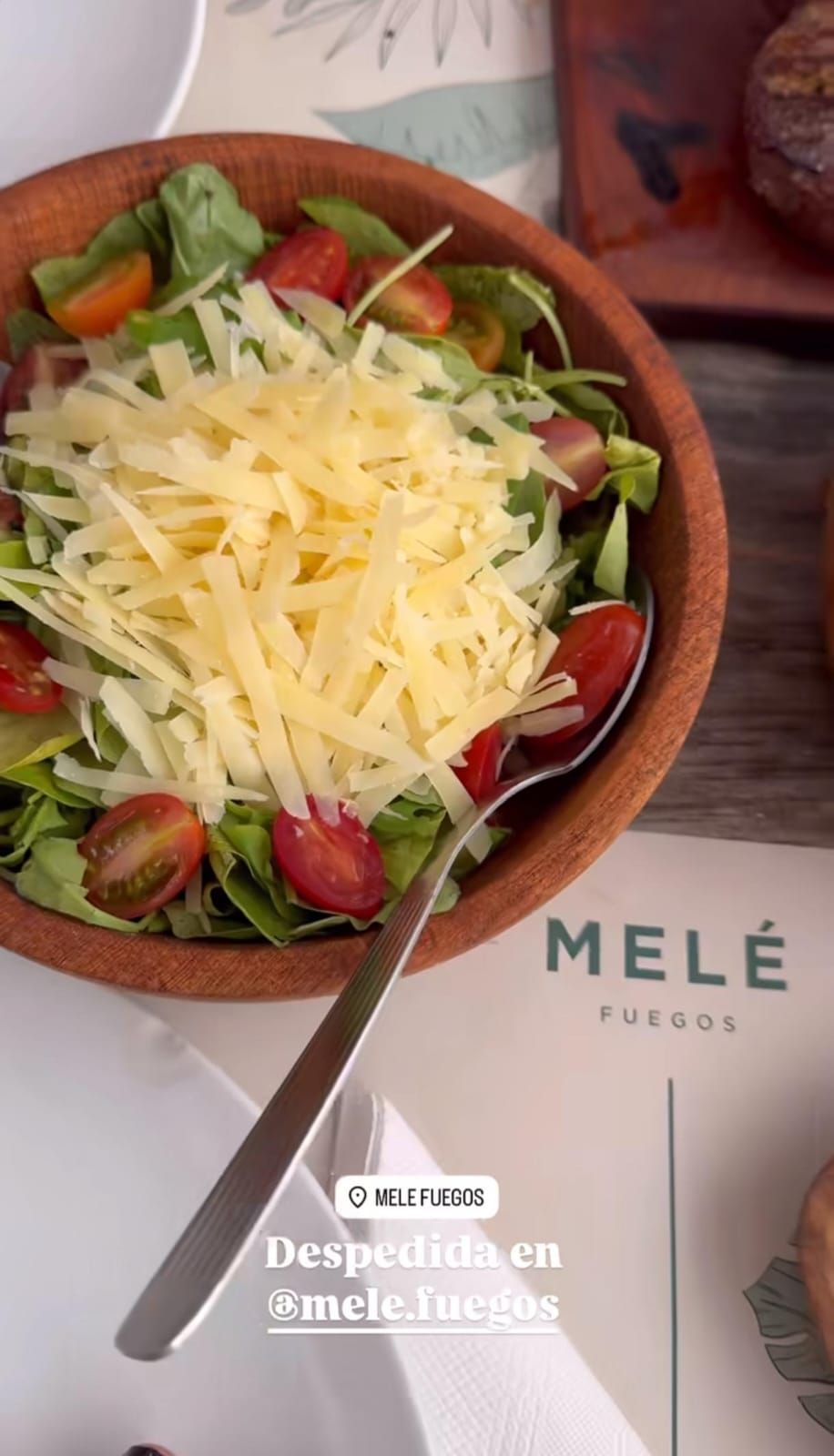 Una ensalada de rúcula, tomates cherry y parmesano rallado es lo primero que se vio en su posteo. Luego enfocó una porción de un jugoso trozo de entraña asada con una porción de papas fritas y, al lado, una cremosa provoleta. Sin dudas, Chaves sabe cómo combinar sabores a la hora de pedir en restaurantes.