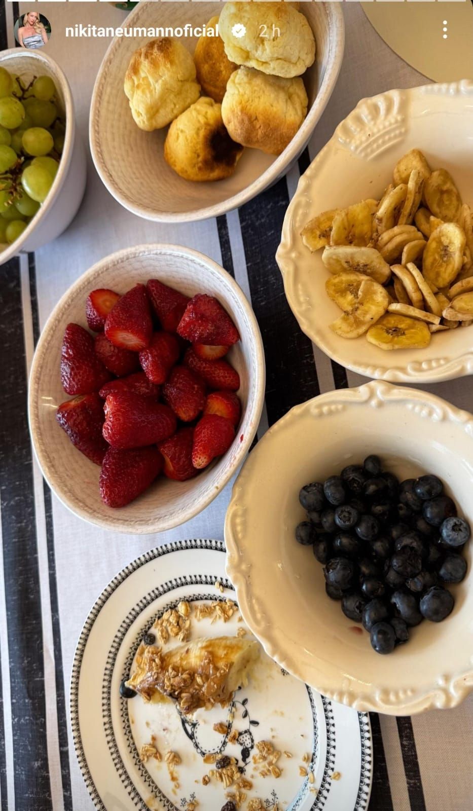 En su reciente posteo, Nicole Neumann evidenció una vez más su espíritu fit al dejar ver su desayuno, con una gran variedad de frutas como arándanos, banana, frutillas y uvas. Al mismo tiempo, incorporó un poco de hidratos con unos pancitos dulces, cuya porción fue más reducida que la de frutas. Sin dudas, la modelo se cuida pero no se priva de nada en su alimentación.