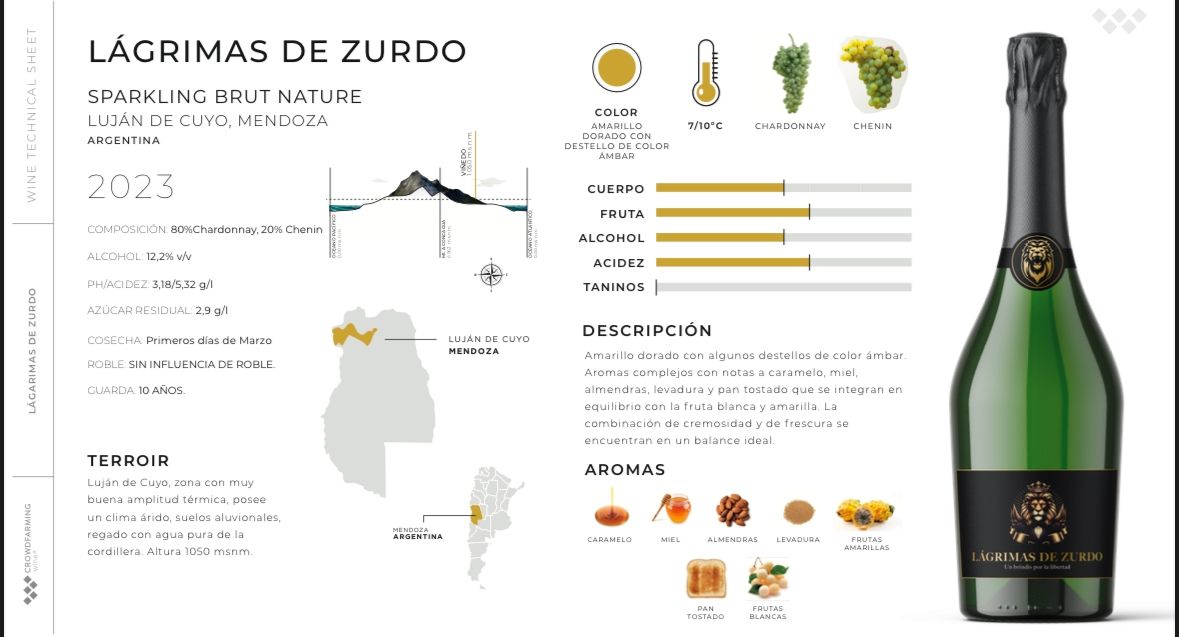 A la hora de hablar de datos técnicos del espumante, la información sostiene que es elaborado en Luján de Cuyo, Mendoza, Argentina. Que las vides son regadas con agua de cordillera a una altura de 1050 metros.