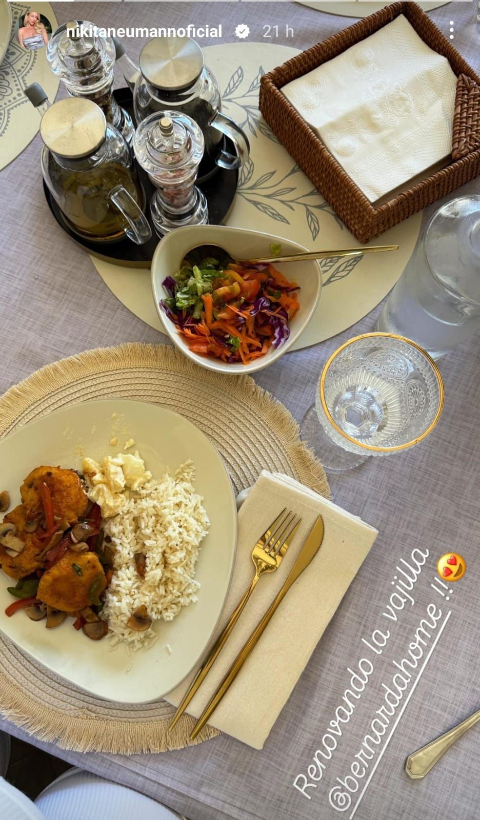 En la imagen se puede ver que los cuchillos y tenedores elegidos por Neumann tienen un color dorado brillante, mientras que la copa es de cristal con una línea dorada en la parte superior, a tono con los cubiertos. En su plato, se pudo ver una suculenta porción de arroz con albóndigas, súper apetitosa.