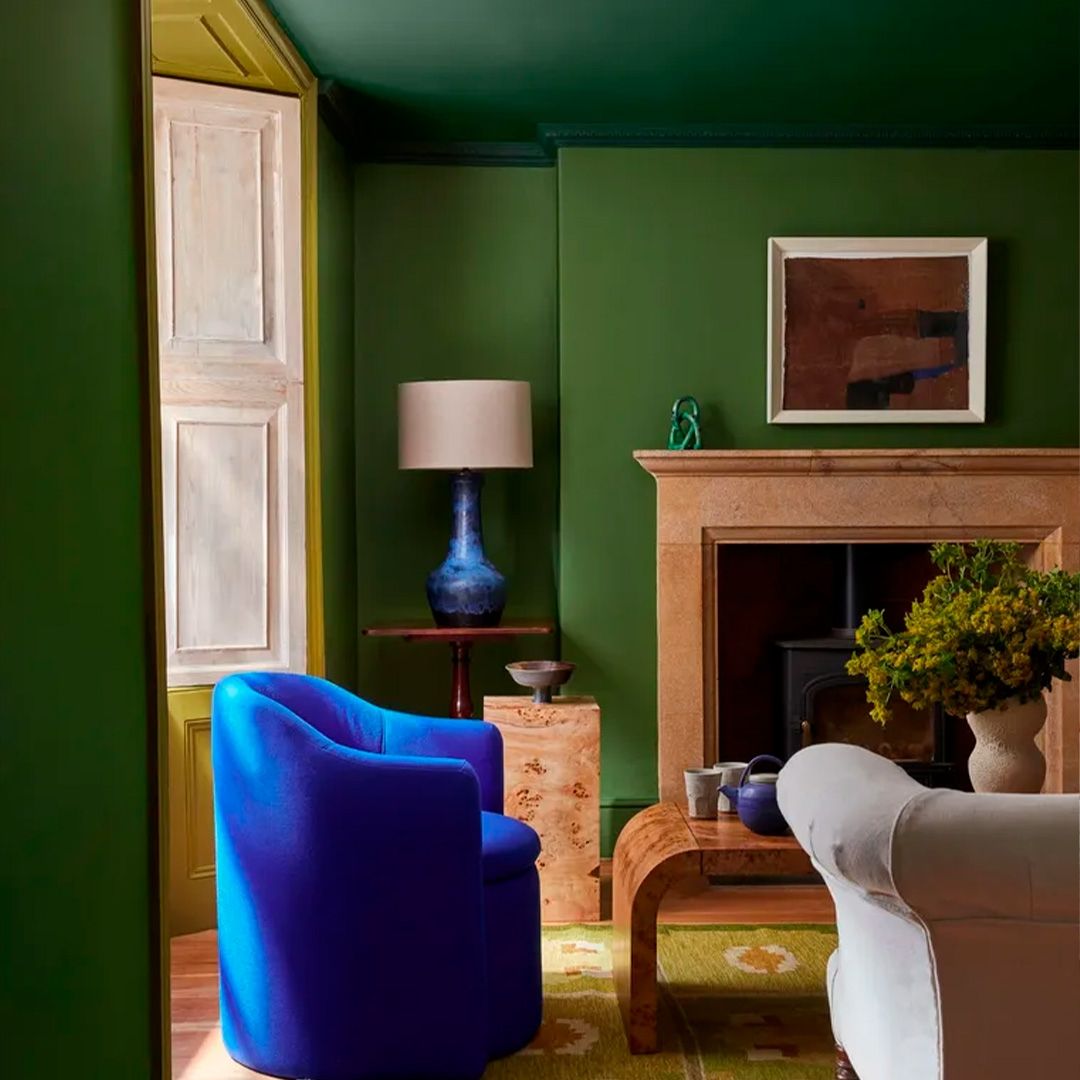 - Verdes y azules profundos. Porque ambos recuerdan al mundo natural por lo tanto pueden resultar reconfortantes cuando se usan juntos. Además aportan un efecto calmante y relajante, que hace que los espacios parezcan más serenos y conectados con el exterior. En la foto un living o sala de estar pintada de verde con techo más oscuro y un sillón de terciopelo azul, con una alfombra vintage.