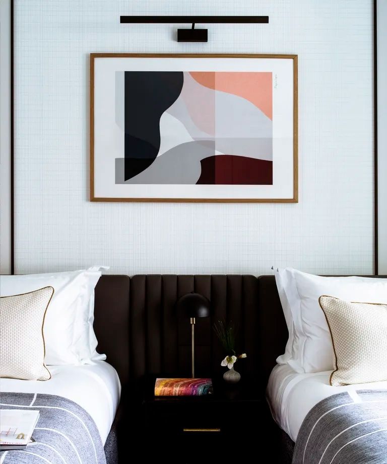 En un espacio más pequeño optar por una cabecera de bajo nivel que se extienda a lo largo de la habitación y cubra tanto la cama como la mesa auxiliar puede ayudar a minimizar el ajetreo.