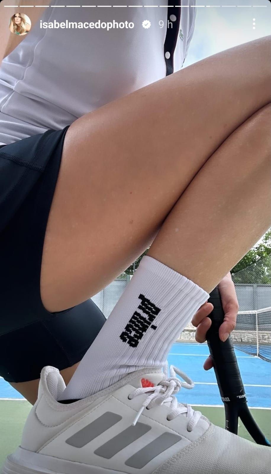 Macedo eligió al tenis esta vez, disciplina que hace quemar muchas calorías a aquellas personas que la practican. Así, la actriz decidió salir de las cuatro paredes de su gimnasio casero y esta vez decidió moverse de manera diferente. Isabel mostró su acertado outfit basado en una remera mangas cortas blanca con detalles en azul, que combinaba a la perfección con su short y medias.