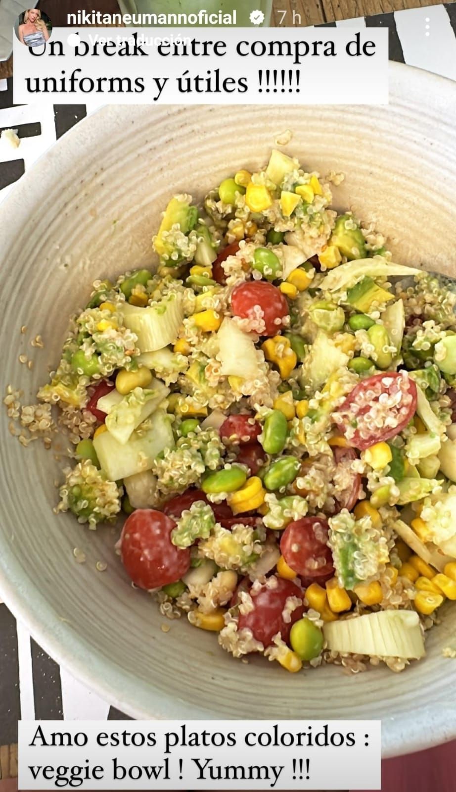 Nicole compartió una historia en su cuenta de Instagram donde se puede ver un bowl cargado de vegetales: tomates cherry, apio, choclo desgranado y quinoa, entre otros. "Amo estos platos coloridos. Vegan bowl. Yummy", soltó la modelo sobre cuánto le gustan este tipo de platos.