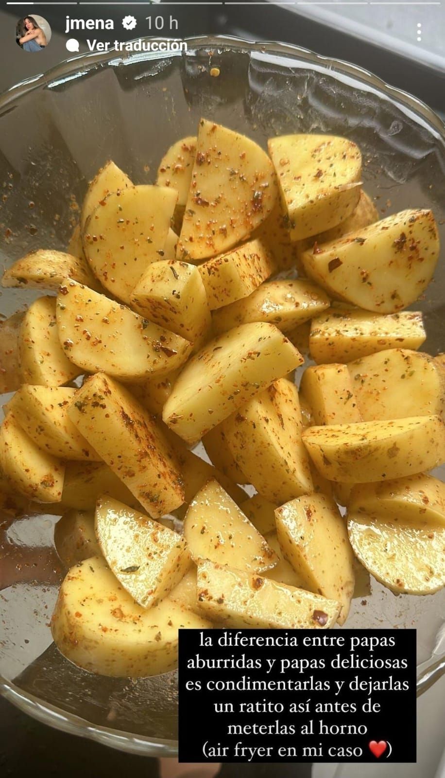 "La diferencia entre papas aburridas y papas deliciosas es condimentarlas y dejarlas un ratito así antes de meterlas al horno", escribió Jimena en uno de sus posteos. Acto seguido, mostró su increíble pollo troceado por ella con condimentos en la piel, que le dieron un adicional de sabor.