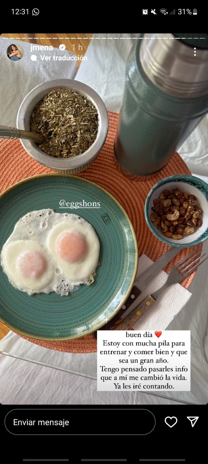 La artista que ha pasado por reality shows como Bailando por un Sueño compartió una imagen que mostró el infaltable mate, que siempre acompaña a Jimena en sus desayunos y meriendas, con dos potentes huevos a la plancha, que se veían muy apetitosos.