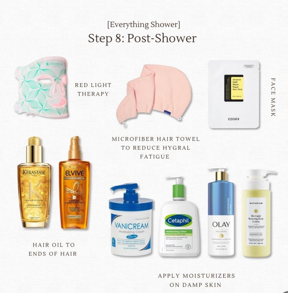 Vas a salir de la ducha, te empezas a secar el cuerpo y humectarte de arriba para abajo. Podés usar una crema corporal, pero especialmente en Estados Unidos utilizan aceite corporal, esto es para que tu piel esté lo más hidratada posible.