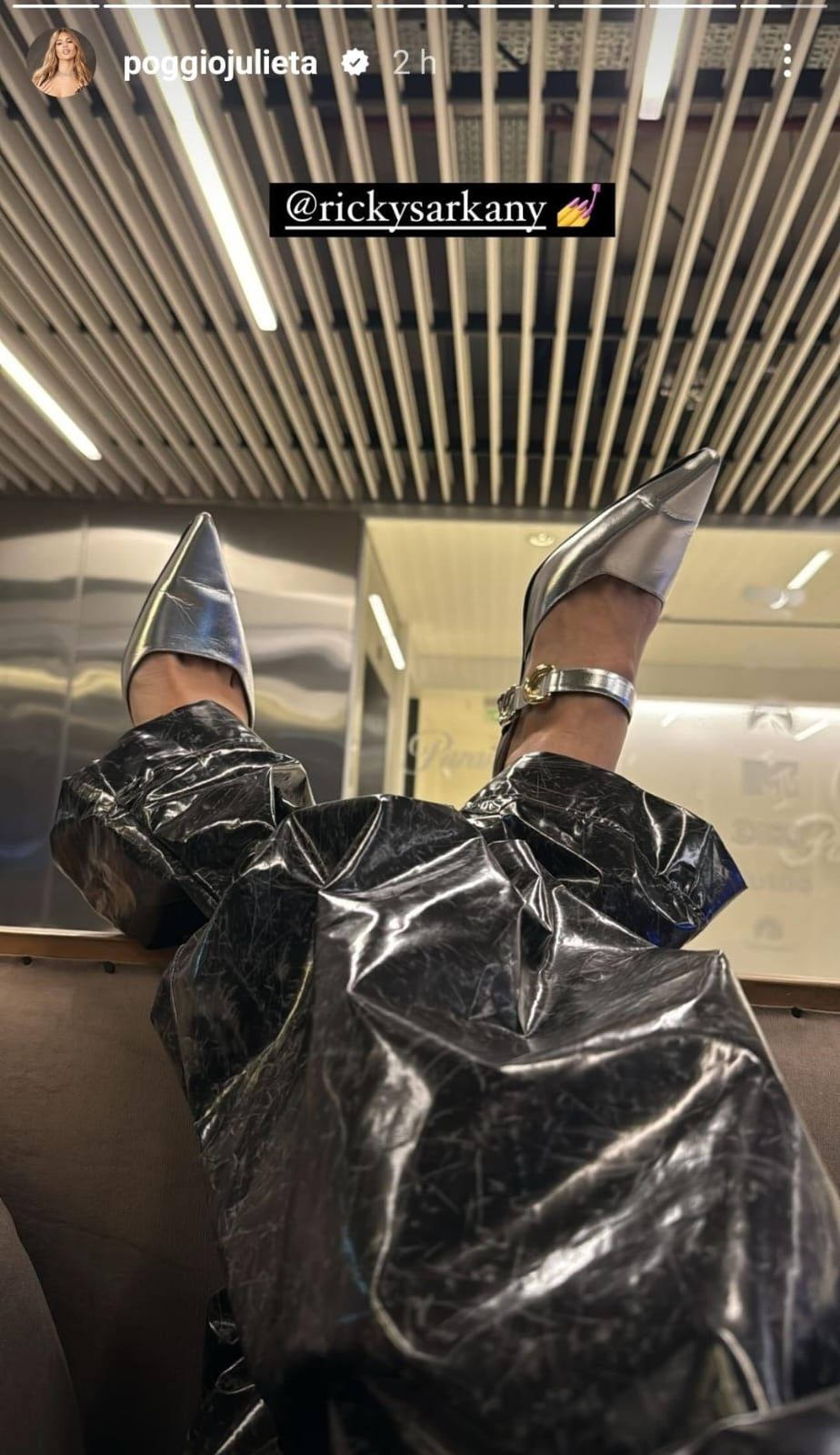 Julieta lució un pantalón simil cuero brillante muy holgado, como si fuera una babucha, tiro bajo. Al mismo tiempo, usó un top que solo cubrió sus pechos y unos zapatos plateados con punta fina que le dieron el toque final al look.