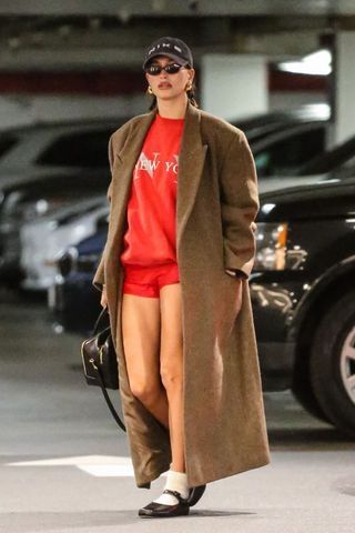 Hailey Bieber es una de las más arriesgadas a la hora de usar microshorts y una clara prueba fue este look. Combinando sus boxer rojos con sweater a tono, tapado ancho en marrón tierra, medias blancas, bailarinas negras, bolso, gafas y gorra, la modelo afirmó que si quieres usar esta tendencia, debes animarte totalmente.