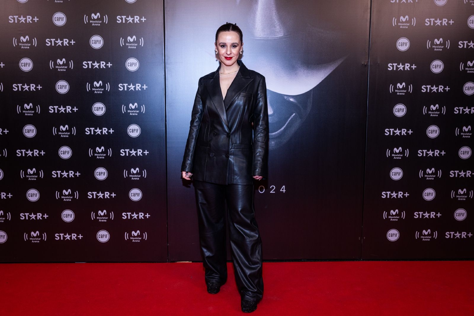 Mery Granados, música e hija del comediante Pablo Granados, se unió a la tendencia sastrera con un conjunto de cuero compuesto por pantalones wide leg y blazer largo de doble botonadura, al que acompañó con botas brillantes y labios rojos para contrastar con la sobriedad del negro.