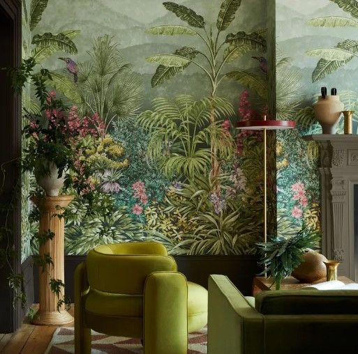 5. Con diseño biofílico. El diseño biofílico busca integrar elementos y patrones naturales en el entorno construido para así fomentar la armonía, bienestar y vitalidad. Un ejemplo -en este caso- es incorporando el empapelado en verde con motivos botánicos o de hojas, ya que se adaptan cómodamente a cualquier diseño interior debido a su relación con el entorno natural y al anhelo de llevar el exterior al interior.