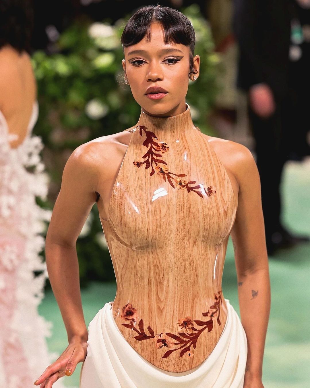 El dúo Loewe y Taylor Russell fue otro que hizo historia sobre la red carpeta de la MET Gala. Este vestido tomó meses en realizarse, ya que el diseñador Jonathan Anderson decidió modelar la madera sobre el cuerpo de la actriz y convertirla en un material textil.
